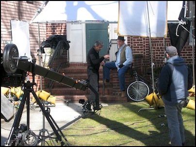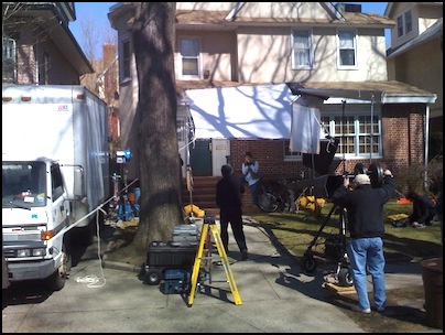 DP Hamid Shams, shooting for Verizon in Brooklyn NY back in March. Our small 3-ton lighting truck wedged in driveway off to left. I wish I could remember the guys name sitting on the stoop, as he was a word class harmonica player who keep us entertained all day.