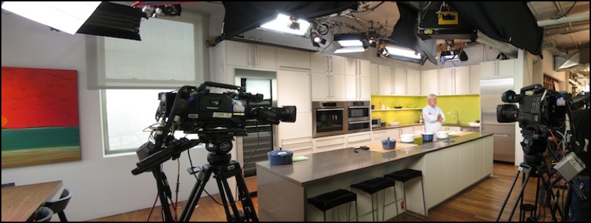 The set of for the cooking show “Avec Eric” rigged out in the production office. My partner Ned Hallick was LD while I played second rigging Grip for the build out days.
